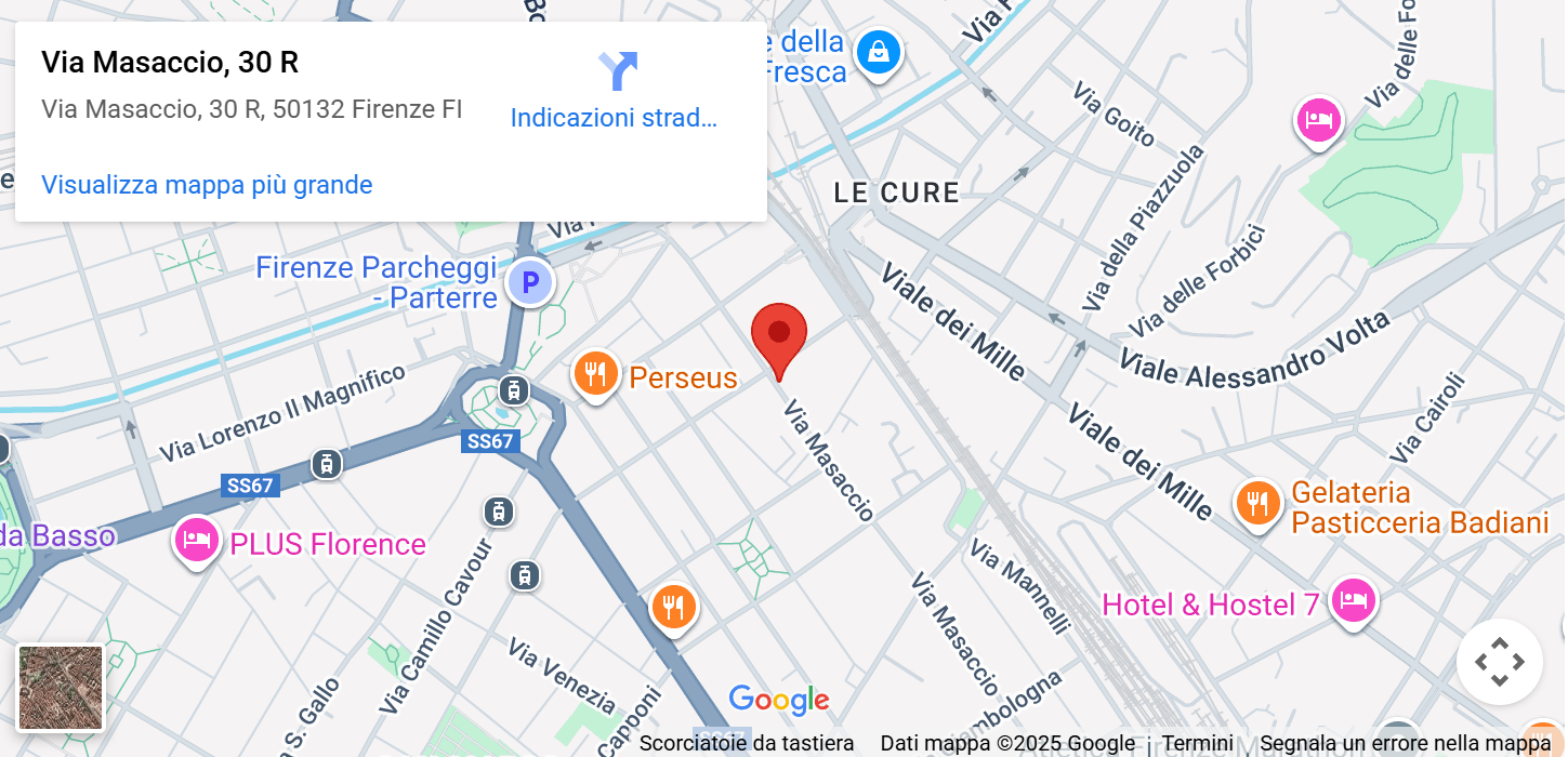 Il Centro Medico Polispecialistico Masaccio si trova in via Masaccio 30R, all'angolo con via Fra Bartolomeo, a pochi metri dalla fermata dell'autobus (Masaccio Botticelli) e della tramvia (Libertà - Parterre).